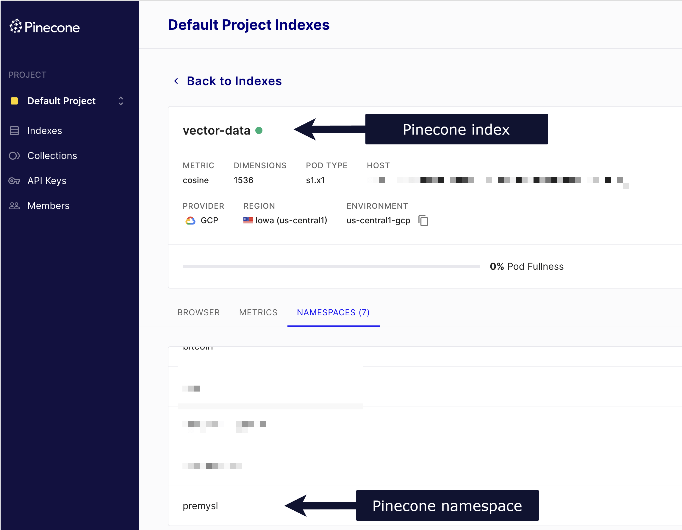 Find your Pinecone index and namespace#